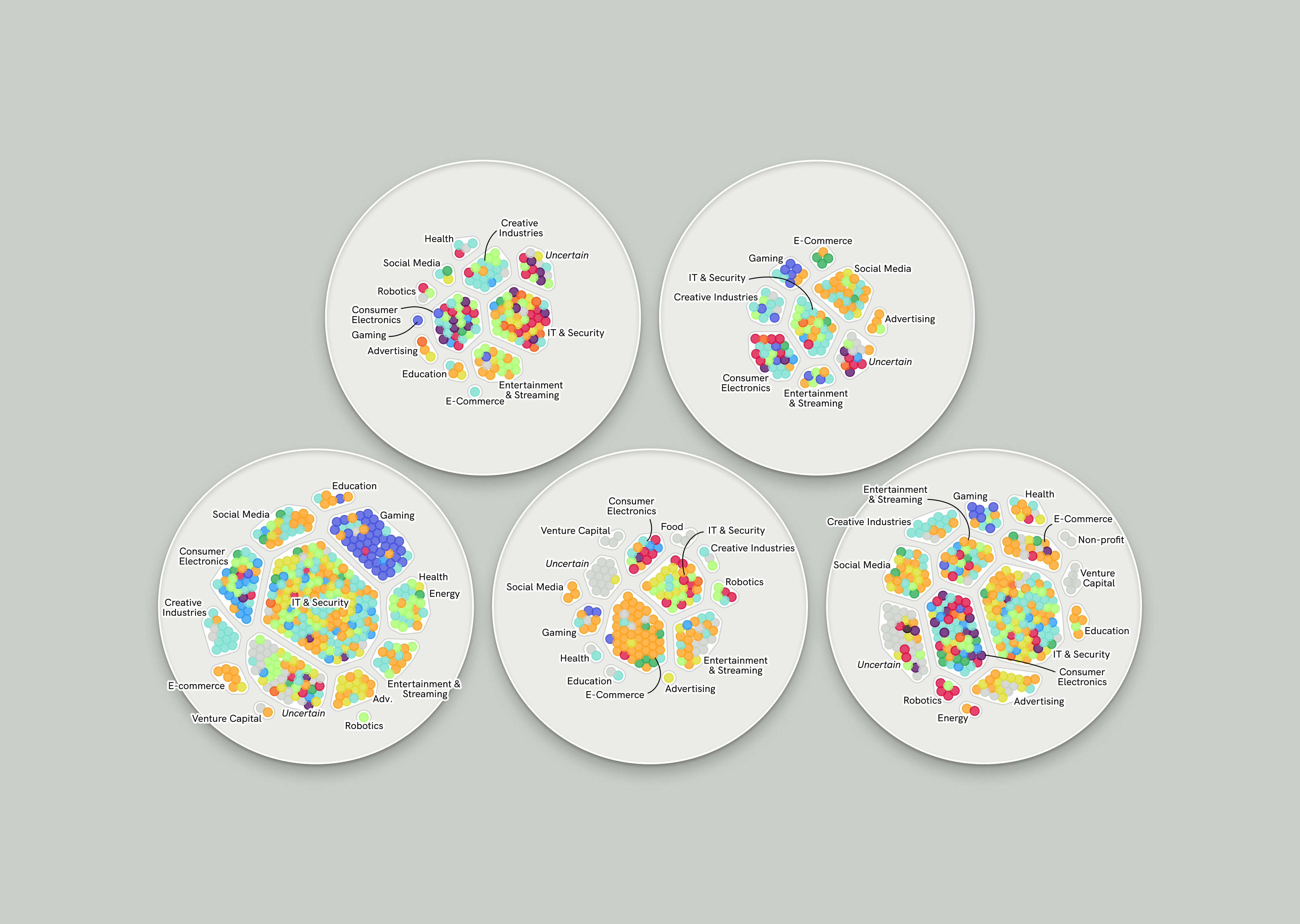 In the Petri Dishes, the visualization shows the areas of interest in GAFAM, highlighting through the colors of each acquisition the technology they bring within each company. By going to temporally analyze the evolution of the Petri dishes (which also take into account the companies that have been sold over time) it is possible to see how the investment focus of each company changes.